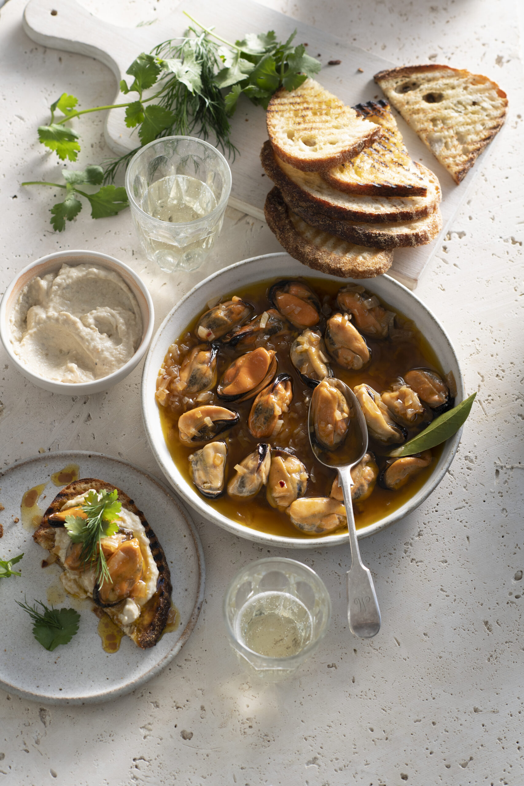 Chef Tom Walton cooked this dish at his first Sydney Seafood School class and has included it in his book More Fish, More Veg. Best thing about this dish? You can make it the day before serving to really let the flavours develop. When you’re ready to eat, scoop the mussels onto baguette toasts or large crostini’s.