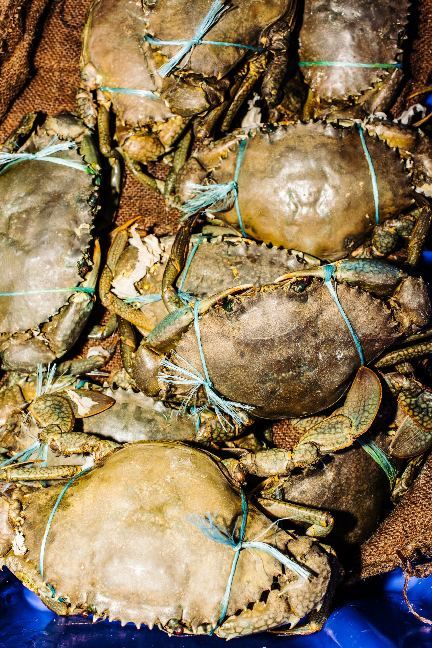 Blue Swimmer Crab – Small and sweet, with a bright blue shell before cooking (like all crustaceans, they turn a bright orange when cooked). These are one of the few crabs not sold live.